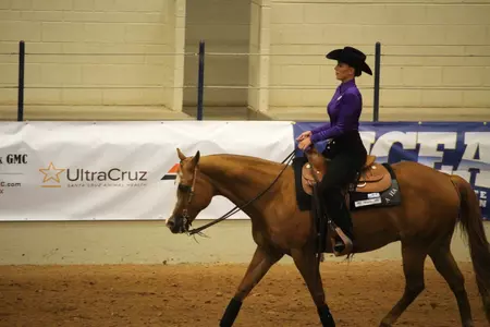 TCU's Equitation Over Fences squad, the No. 7 seed, took care of business against Sweet Briar, the No. 10 seed. Jayme Omand began the action with a 165-point ride on Dillon, ultimately defeating the Vixens' Emily Scholsberg. Elizabeth McKim rode next for the Frogs, earning a 169 on Teddy, but the head-to-head ended in a draw with Sweet Briar's Makayla Benjamin. Raegan Rast fell by one to Katie Balding, 160-159. The final point for the Purple and White came from Alex Beneson, who earned herself an impressive 170-point ride on Franc, downing Lilly Peterson by a margin of 18.